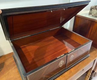 Escritorio de campaña en madera de caoba con incrustaciones en nacar. Con apertura superior y frontal de dos hojas. Con dos compartimentos inferiores para utensilios de escritura