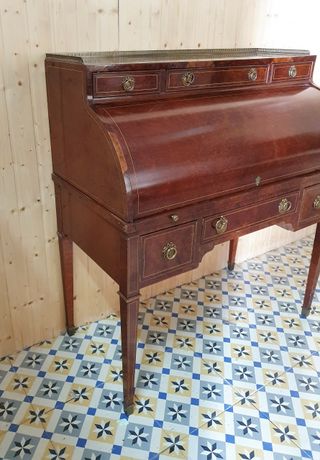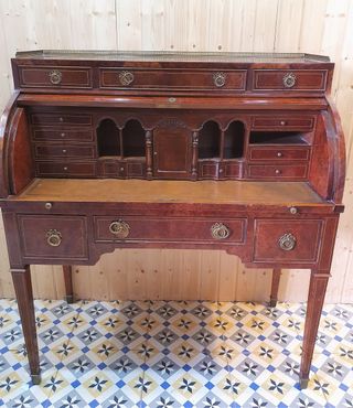 Escritorio antiguo bureau de cilindro estilo Luis XVI. Antiguo escritorio de cilindro-tambor en madera de raíz, estilo Luis XVI. Cajones en el faldón y a gradin en la parte superior, ésta con barandilla de bronce dorado. Dos pequeños tiradores permiten extraer una superficie, tapizada en cuero verde, para escribir, a la vez que se recoge la tapa, de tambor, que deja ver un frente de cajonería organizada geométricamente en dos bloques de cajones laterales y cuerpo central de arcos sobre cajoncillos de frente serpentinado y capilla central con puertecilla entre columnas. MEDIDAS 105 X 53 X 118 CM DE ALTO