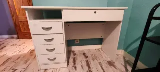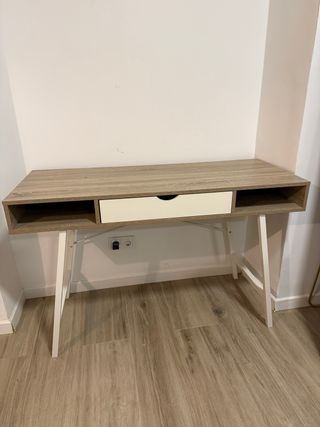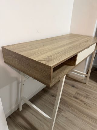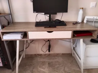 Escritorio funcional con un diseño moderno. - Superficie espaciosa para trabajar o estudiar. - Cajón integrado para almacenamiento adicional. - Una pata metálica y otra de madera. - A recoger en Portugalete. - El escritorio tiene algunas marcas del uso, se pueden ver en la última foto.