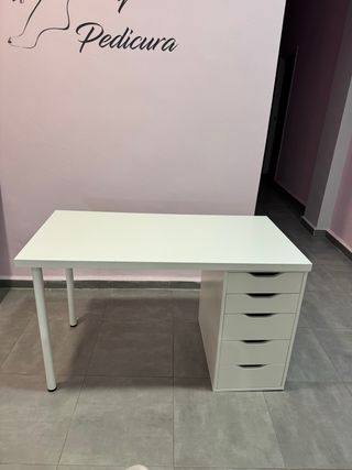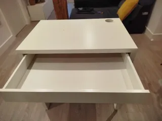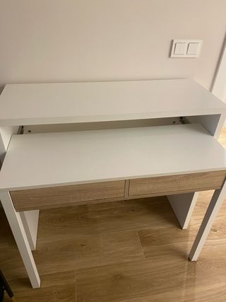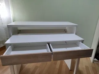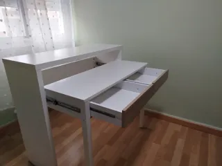 Escritorio blanco de ikea, con un diseño moderno y funcional. Extensible, perfecto para sitios pequeños. Ocupa muy poco espacio y es muy cómodo. Está en bastante buen estado, lo único, hay que apretarle los tornillos ya que se tambalea un poco (nada importante, pero de ahí el precio). - Estructura principal de madera. - Cajones con tiradores decorativos. - Superficie lisa y fácil de limpiar.