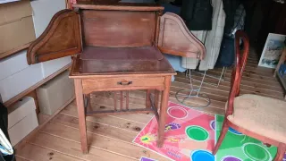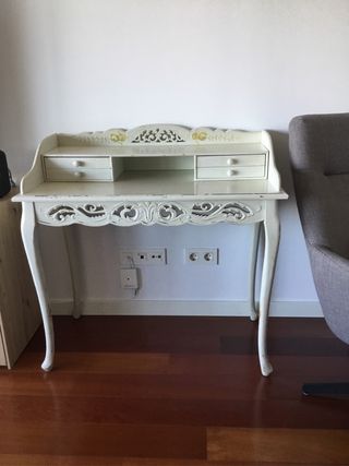 Escritorio de madera maciza de estilo vintage / shabby chic, con acabado decapado en tonos claros y tablero de madera oscura. Pieza con mucho carácter y detalles clásicos. ✔️ Incluye cajones y compartimentos integrados, muy práctico como escritorio, consola o mesa auxiliar decorativa. ✔️ Estructura sólida y estable. ✔️ El desgaste visible forma parte del estilo original (no es un defecto), ideal para ambientes rústicos, vintage o boho. 📐 Medidas: Ancho: 119 cm Alto: 104,5 cm Fondo: 45 cm