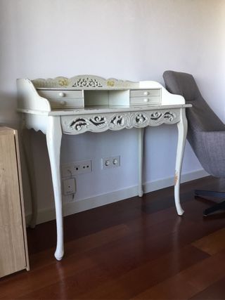 Precioso escritorio de madera con múltiples cajones. - Diseño clásico y elegante. - Tiradores metálicos dorados. - Patas torneadas.