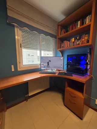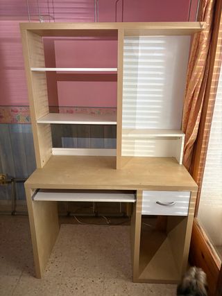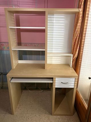 Mesa de escritorio con diseño en L y estantería integrada. - Estructura principal de madera. - Estantería superior con varias baldas. - Cajones inferiores para almacenamiento. - Mesa con agujero en la esquina para cables. En perfectas condiciones; se vende por cambio de habitación. Quién lo quiera debe saber desmontarlo...