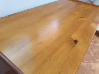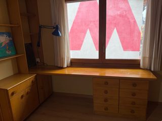 Escritorio funcional con espacio de almacenamiento. - Diseño de madera natural barnizado. - Cuenta con un cajón principal de 55x43x10cm (anchoxfondoxalto) - Incluye un módulo lateral con cuatro cajones de 27cm ancho. - Estantería abierta en el lateral izquierdo (hay q repararla,ya que los tornillos han gastado la madera y puede caerse la balda) Lo ha dado todo y tiene alguna marca del uso, pero es muy buen escritorio.