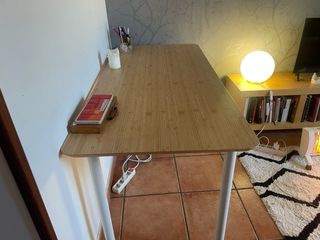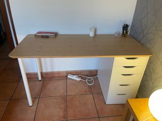 Escritorio de madera en muy buen estado. - Acabado en madera clara. - Incluye un práctico cajón. - Patas de madera estables. Casi nunca lo uso, ya no lo uso. Es el "Lisabo" en la web de Ikea (nuevo, 169 euros)