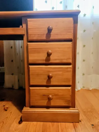 Escritorio de madera de pino con un diseño clásico y funcional. Cuenta con tres cajones integrados para almacenamiento. - Tres cajones con tiradores redondos. - Patas con un diseño decorativo. - Amplia superficie de trabajo. ( También vendo mesita de noche a juego, ver fotos en mi perfil)