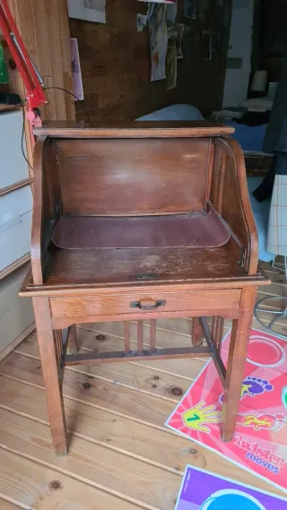 Vendo escritorio de madera clara con estantería superior, muy práctico y funcional. Dispone de bandeja extraíble para teclado, cajón y varios estantes para libros, material de estudio o decoración. Perfecto para: Habitación juvenil Estudio u oficina en casa Mesa de ordenador Mueble sólido y estable. Presenta signos normales de uso y algún roce superficial (ver fotos), pero está en buen estado general. 📍 Recogida en mano 📦 No envío por tamaño 💰 70 € negociables