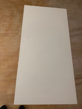 Escritorio moderno con un diseño limpio y funcional. - Superficie de madera en color blanco. - Un cajón central en color negro. - Patas metálicas resistentes. - La superficie esta algo sucia, se puede pintar o disimular con el tapete negro como se muestra en la ultima imagen. Si quieres solo la mesa lo puedo bajar a 40€