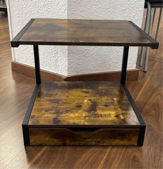 Práctico estante de escritorio de dos niveles con un cajón para almacenamiento adicional. Su diseño rústico de madera y metal le da un toque moderno. - Dos niveles para organizar tus objetos. - Cajón integrado para guardar cosas. - Estructura de metal negro.
