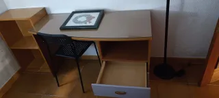 Tengo 2 estanterías a juego, hago precio comprando todo. Escritorio en tonos beige y marrón, acabado imitación madera, algo rugoso pero fácil de limpiar. Vendo por redecorar la habitación. Dimensiones: 130 x 53.5 cm, altura 78 cm Hueco: 43.5 x 30 cm, fondo 47 cm Dos cajones: 38 x 12.5 cm, fondo 34 cm
