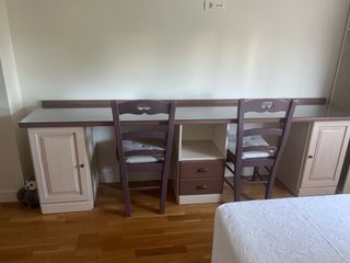 Conjunto de muebles para dormitorio juvenil. Muy bien cuidado,prácticamente nuevo. Se vende por cambio de habitación. Contiene: - Escritorio 185 x 53. -Cajón interior bajo el escritorio, con ruedas 100 x 53. - Armario con 6 cajones 112 x 50. - Base de cama y dos somier 90 x 190. -Espejo 175 x 50.