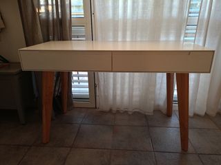 Mesa versátil que puede usarse como escritorio o tocador. Su diseño combina materiales naturales y modernos. 2 MESAS 99€ cada una - Tablero de bambú con acabado liso. - Patas de metal blanco. - Tres cajones integrados con tiradores redondos. Su precio 149€ cada una . Compradas este año . Medidas 102 x49x72 No envío Hay que recoger . Se venden por cambio de mobiliario. Se ahorran el montaje SIN MÁS BAJADA DE PRECIO Se venden juntas o por separado.