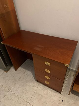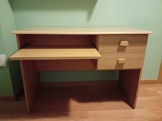 Escritorio de madera con un diseño clásico y funcional. - Dos cajones con tiradores redondos. - Acabado en tono madera natural. Tienes un desperfecto en el cajón y otro en una esquina, pero cosas de poco. Escucho ofertas.ultima semana