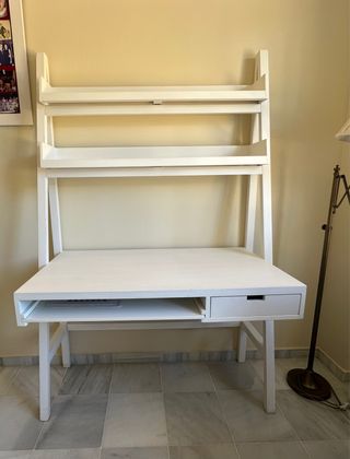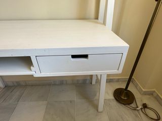Preciosa mesa de escritorio de madera blanca con estantería incorporada. Ideal para organizar tu espacio de trabajo o estudio. - Diseño elegante y minimalista. - Incluye un cajón para guardar tus cosas. - Perfecto estado de conservación.