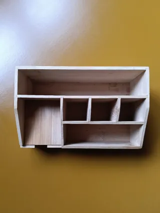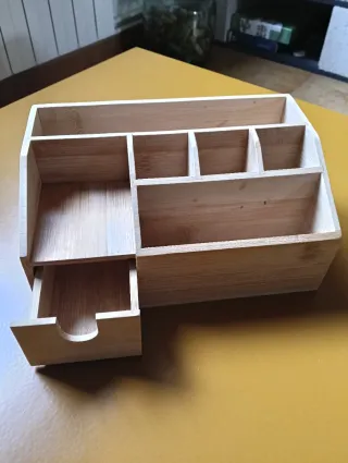 Práctico organizador de escritorio con varios compartimentos y un cajón. - Fabricado en bambú. - Diseño de sobremesa. - Múltiples divisiones para organizar objetos.