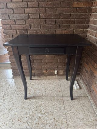 Elegante mesa de escritorio con un diseño clásico y patas curvas. Ancho 79cm Fondo 50cm Alto 75cm - Un cajón central con tirador. - Superficie lisa y amplia. - Patas estilizadas. - Arañazo por desgaste en una pata y debajo de la mesa