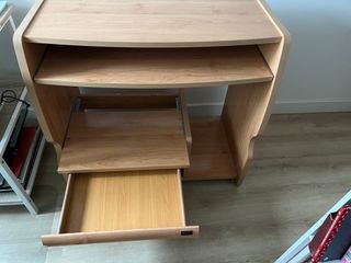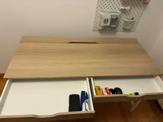 Vendo escritorio de IKEA con cajonera incorporada. Incluye la tapa de mesa y una cajonera de almacenaje con 5 cajones: 3 más grandes y 2 más pequeños, muy prácticos para guardar cosas. El escritorio está en buen estado general. Tiene algunas pequeñas marcas de uso en los bordes, normales del tiempo, y en el primer cajón hay un pequeño levantamiento, que se puede ver en las fotos. Nada que afecte a su uso. En realidad se ha usado muy poco como escritorio, sobre todo para almacenaje, por lo que los cajones están bastante bien y siguen siendo muy útiles. Ideal para estudio, oficina o habitación. Cualquier duda, escríbeme sin problem