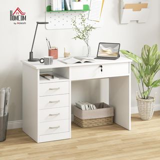 Escritorio para Oficina y Habitación, Escritorio para PC y Computadora, de Madera con 5 Cajones, Mesa de Trabajo, 2 Llaves, Moderna, 110X50X76Cm, Blanco