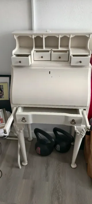 Elegante secreter o escritorio de estilo antiguo, pintado en blanco - Diseño con múltiples cajones. - Tiradores redondos dorados. - Patas torneadas.