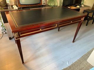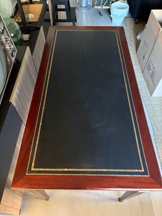 🚨 URGENTE – Escritorio clásico madera con cajones 🖤✨ Escritorio estilo clásico con acabado en madera y superficie tapizada en negro con detalles dorados. Tiene mucho carácter y presencia, ideal para despacho, decoración o incluso como pieza de atrezo 🎬 📏 Medidas: 140 cm ancho 70 cm fondo 77 cm alto 🗄️ Cajones: Exterior: 61 x 7,5 cm Interior: 58 x 47,5 x 5 cm ✔️ Estructura sólida ✔️ Detalles decorativos dorados muy bonitos ✔️ Superficie amplia y cómoda ⚠️ Tiene marcas de uso/desgaste visibles (ver fotos), de ahí el precio. 💰 Precio: 30€ (negociables).