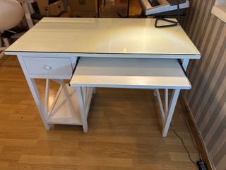 Elegante escritorio de madera maciza pintada de blanco, con superficie de cristal, cajón deslizable y bandeja de teclado. Precio original: 334€.