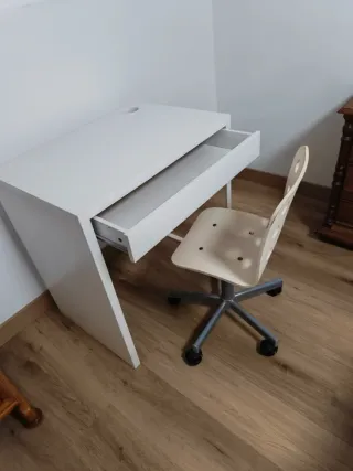 Conjunto de escritorio y silla. - Escritorio de color blanco con un cajón. - Silla de color blanco con ruedas.