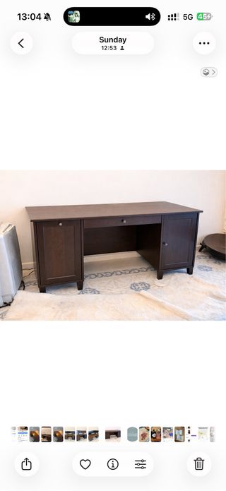 Precio nuevo 549€ Elegante escritorio de madera con un acabado oscuro. Cuenta con un diseño clásico y funcional, ideal para cualquier espacio de trabajo. Tiene 2 meses - Dos puertas laterales con almacenamiento. - Un cajón central. - Amplia superficie de trabajo.