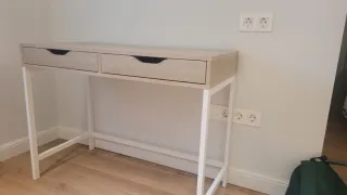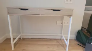 Venta por mudanza. Solo para recoger en persona en un punto intermedio tras realizar la compra por wallapop. No se visita. Escritorio. Mesa de estudio blanca en perfecto estado, sin usar. Es compacta y práctica, ideal para estudiantes con espacios reducidos. Comprada en Leroy Merlín y sin usar finalmente. - Medidas: 80cm de ancho. - Dos cajones frontales para almacenamiento. - Patas robustas para mayor estabilidad.