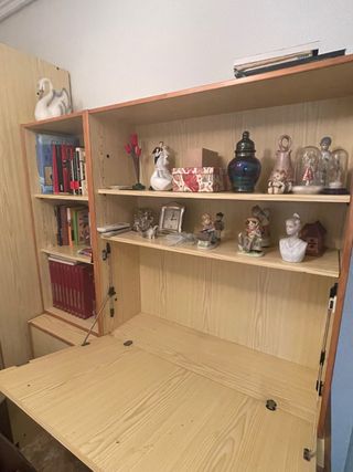 Escritorio de madera con diseño de estantería. - Cajón con tirador. - Compartimento superior abatible. - Estante inferior. MEDIDAS: ANCHO 80cm FONDO 57cm (cerrado) FONDO 92cm (abierto) ALTURA: Escritorio: 100cm Completo: 206cm Se encuentra desmontado la parte superior y embalado. Actualmente sólo montado el escritorio (como aparece en la primera foto).