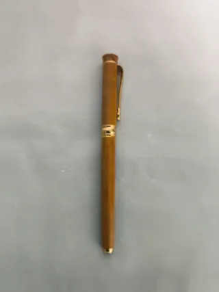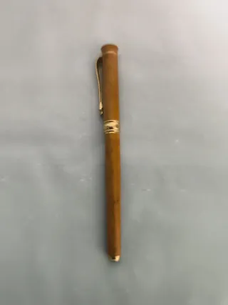 Elegante pluma estilográfica con detalles dorados. - Cuerpo de color marrón madera. - Clip y anillo decorativo en tono dorado.