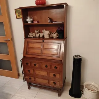 Escritorio secreter antiguo con tapa abatible. - Diseño clásico y funcional. - Acabado en madera oscura. - Tiradores ornamentales.
