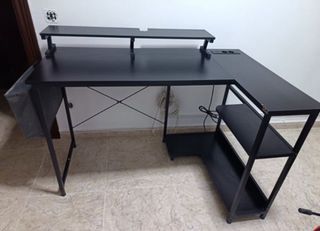 Mesa/Escritorio gaming para ordenador con cpu de madera y metal negro Características: - Medidas: L 139,7cm x Al 92,71cm x An 56,69cm. Altura soporte pc 15,87cm - 2 baldas a los laterales para almacenaje - Soporte para cpu - Balda elevada pc para una buena postura ergonómica La mesa la entrego desmontada y con instrucciones A tener en cuenta: -El tablero principal de la mesa tiene restos de pegamento adhesivo ya que tuve un papel decorativo encima, se puede quitar con alcohol y paciencia no corres el riesgo de llevarte la pintura (ya lo he probado) -Decoloración y rayajo en una de las baldas laterales por un producto de limpieza