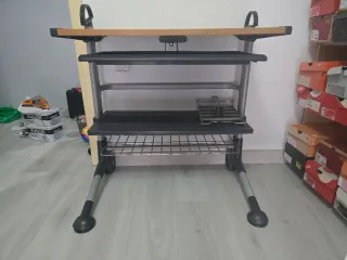 Mesa móvil para ordenador con varias bandejas y ruedas. - Estructura principal en plástico duro. - Bandejas de color gris. - Ruedas para facilitar el desplazamiento.