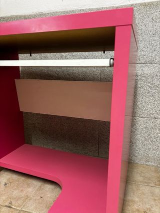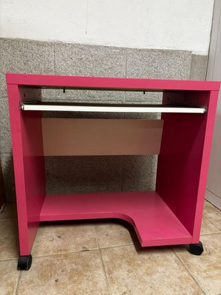 Mesa de ordenador práctica y funcional, con un diseño moderno. - Estructura principal en color rosa. - Bandeja extraíble para teclado. - Estante inferior. - Ruedas para fácil movilidad.