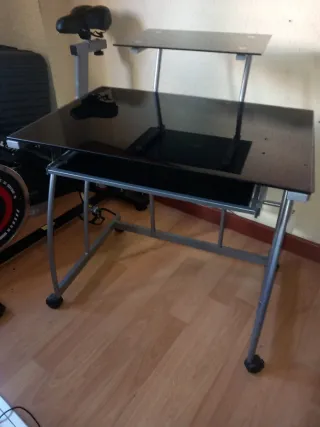 Mesa de ordenador con un diseño moderno y funcional. - Superficie superior de cristal negro. - Bandeja extraíble para teclado. - Estructura metálica plateada. - Ruedas para fácil movilidad.Recojer en la felguera