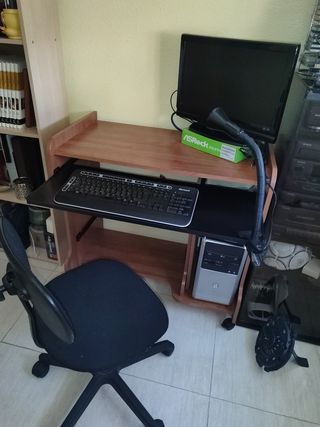 Mesa para ordenador, con un hueco en medio para poner la pantalla. Tiene bandeja para el teclado, soportes para torre e impresora y un espacio atrás para poner una regleta o cables. Se puede mover facilmente ya que tiene ruedas. En perfectas condiciones.