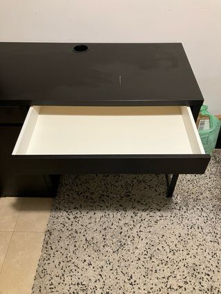 Mesa de escritorio de Ikea en color negro. Cuenta con dos cajones integrados para almacenamiento y con una puertecita con tres baldas para dipositar objetos. Tambien dispone de un agujero integrado para pasar cables en caso de poner una pantalla de ordenador. Desperfecto: tiene una grieta en que se ve un poco la madera de la que esta hecha, el resto esta perfecto. - Diseño moderno y funcional. - Superficie amplia para trabajar. - Orificio para gestión de cables.