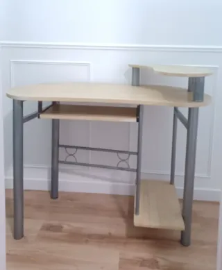Mesa de escritorio con bandeja extraible para teclado o para ampliar superficie de la mesa. Con ruedas. Usada pero en buen estado - Acabado en madera clara. - Estructura de metal. - Bandeja extraíble para teclado. Dimensiones 77x50x75 alt Ideal para espacios reducidos! Despacho, oficina, teletrabajo, mesita, mesa, mesa ordenador, gaming