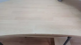 Escritorio amplio con diseño moderno. - Superficie de madera clara. - Patas metálicas blancas. - Compartimento de almacenaje integrado. Pensado para poner la torre de un pc. tiene un pequeño desperfecto en la parte superior. Segunda foto. Actualmente desmontado cabe perfectamente en un coche.