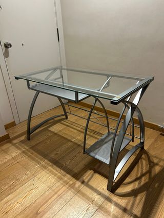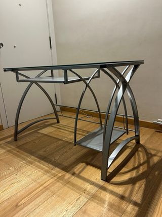 Elegante mesa de escritorio con superficie de cristal y estructura metálica en perfecto estado. Se entrega desmontada, incluye instrucciones. Medidas: 90 cms largo 60 cms ancho 75 cms alto - Bandeja extraíble para teclado de ordenador. - Estantes para almacenamiento. - Patas terminadas en ruedas.