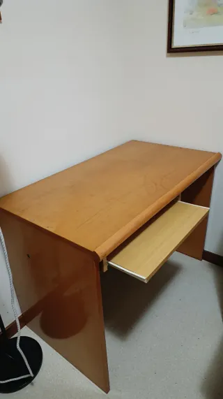 Conjunto de escritorio y silla para habitación juvenil. El escritorio tiene un diseño sencillo y funcional, y la silla está tapizada. - Escritorio de madera con bandeja para poner el teclado del ordenador. Medidas: 100,5 cm x 50 cm x 76 (alto) Precio: 20 euros. - Silla con asiento y respaldo tapizados. Medias: 43,5 cm x 41 cm (profundidad) x 81 cm (alto). Respaldo: 38 de alto. Medidas del asiento! 36 x 37. Precio: 20 euros