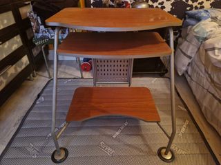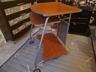 Mesa de madera y patas de metal. Con sus 4 ruedas Puede servir de escritorio, aparador de libros, o para poner radio o la televisión. Cómo se ve en las fotos. Con señales normales de uso y envejecimiento. Mesita pc / TV / expositor / etc.