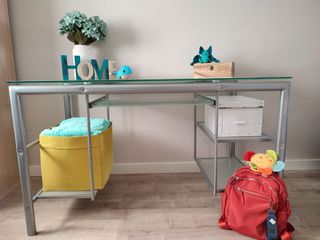 Mesa de escritorio de cristal y metal, con un diseño elegante y moderno. Es compacta y funcional, ideal para espacios reducidos. - Dispone de tres compartimentos para organizar tus cosas. - Perfecta para usarla como escritorio de ordenador. - Se encuentra en buen estado.