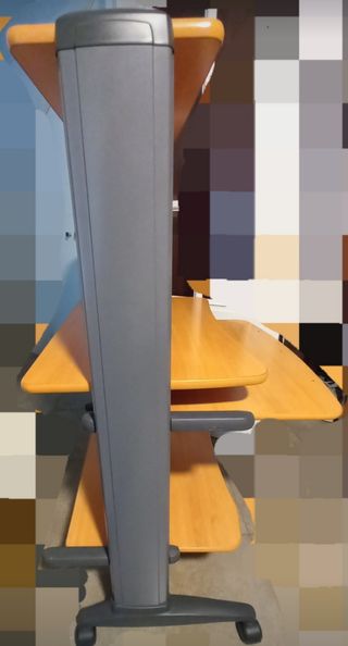 Mesa de trabajo versátil. Alturas regulables (ideal si se quiere usar de pie o caminando sobre cinta). Con balda auxiliar y accesorios para PC y Monitor. Todo desmontable y ajustable, muy fácil. Entrego desmontada lo justo para facilitar su transporte. Incluye todos sus componentes (tb fotos para su montaje). La zona desgastada realmente apenas se nota.