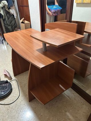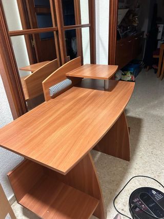 Escritorio de madera en muy buen estado. Apenas se ha usado. - Incluye estanterías y cajones. - Estructura robusta y estable. - Diseño práctico y funcional. - Hueco para cables. - Espacio para teclado de ordenador y torre. Precio negociable.