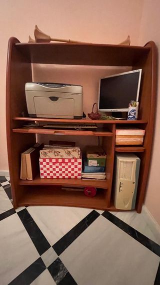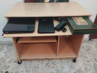 Mesa de ordenador de madera en color marrón. Está en buen estado, aunque tiene algunos pequeños desperfectos por uso( ver fotos). - Dispone de dos estantes extraibles,para el teclado 80 x44cm, Segunda bandeja para impresora 51x44cm y espacio para CPU 20x57x44 - Incluye ruedas para facilitar su movilidad. - Perfecta para organizar tu espacio de trabajo.