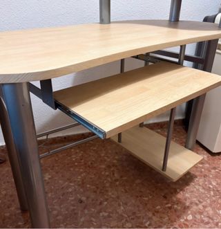 Mesa de ordenador compacta y funcional, ideal para espacios reducidos. Tiene dos niveles de superficie y está montada sobre una estructura metálica con ruedas. Se encuentra en buen estado. - Superficie principal amplia. - Nivel inferior para teclado u otros accesorios. - Estructura ligera y fácil de mover gracias a sus ruedas.
