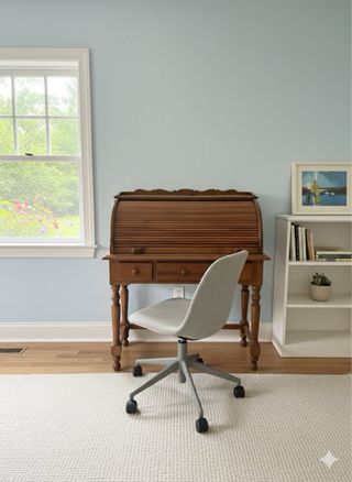 Elegante escritorio tipo bureau con un diseño clásico y funcional. La persiana enrollable protege el área de trabajo.