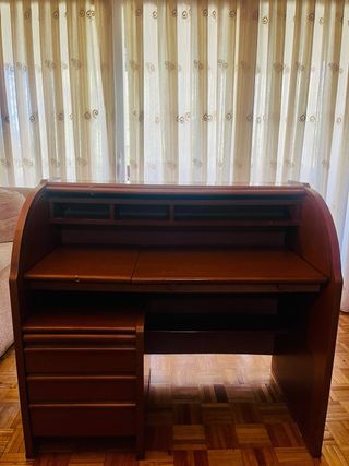 Elegante escritorio de madera con un diseño clásico y funcional. Perfecto para tu espacio de estudio u oficina. - Cajones superiores para organización. - Persiana enrollable para ocultar el área de trabajo. No se lleva, hay que venir a recogerlo.