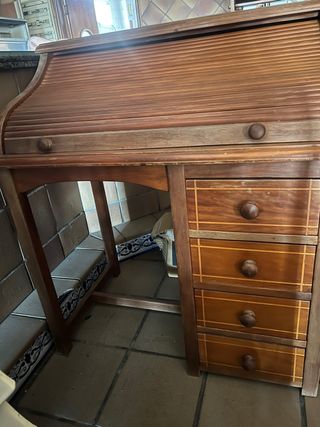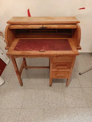 - Escritorio de persiana tipo americano, antiguo - Con 4 cajones, 1 de ellos con cerradura secreta. - Mecanismo de persiana enrollable. - Cajones con tiradores integrados. - Cerradura con llave en la parte superior. - Madera de roble - Aunque tiene agujeros de carcoma está tratado desde hace años - Venta en persona en Jaca